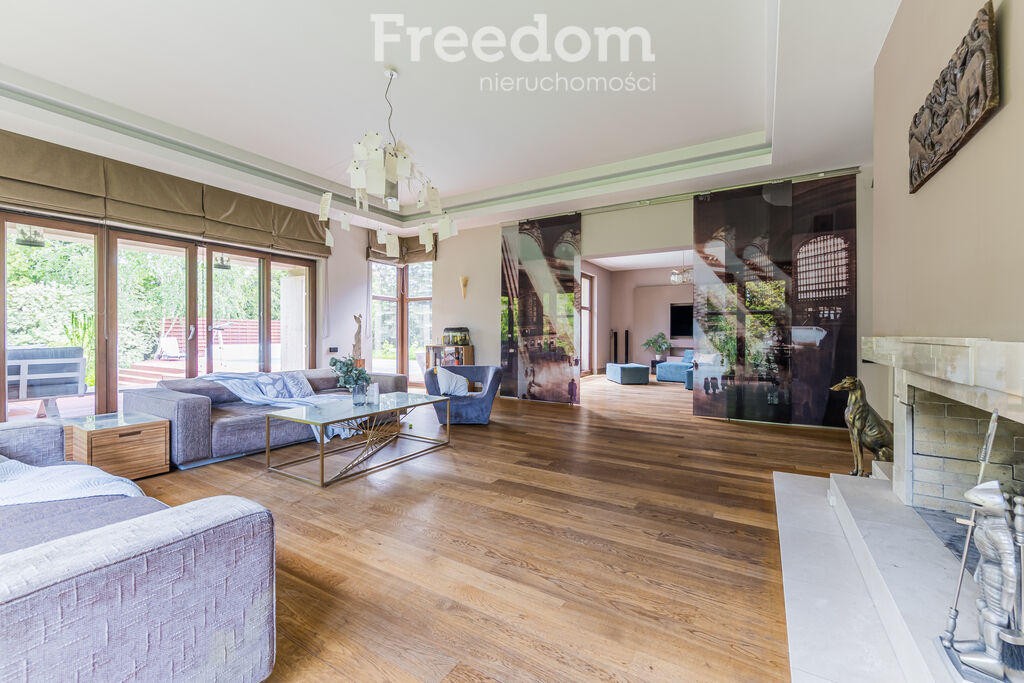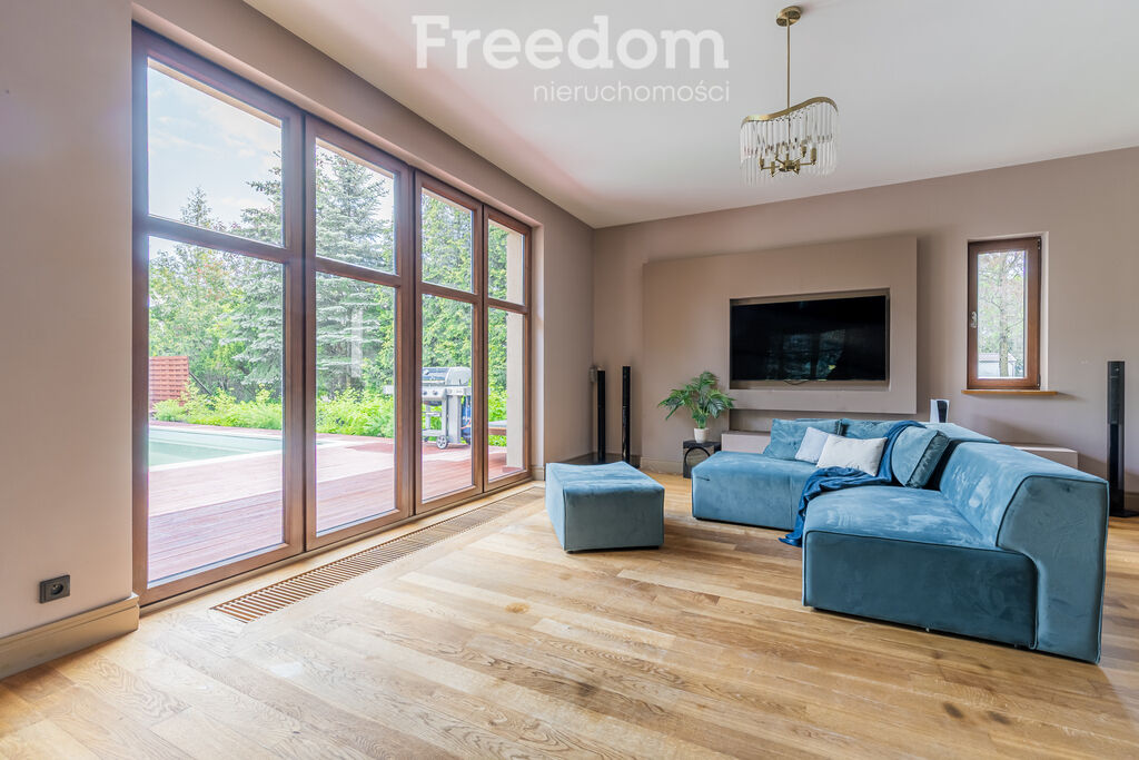 (49,5 m²) z dużymi oknami, kominkiem i wyjściem na taras i basen z